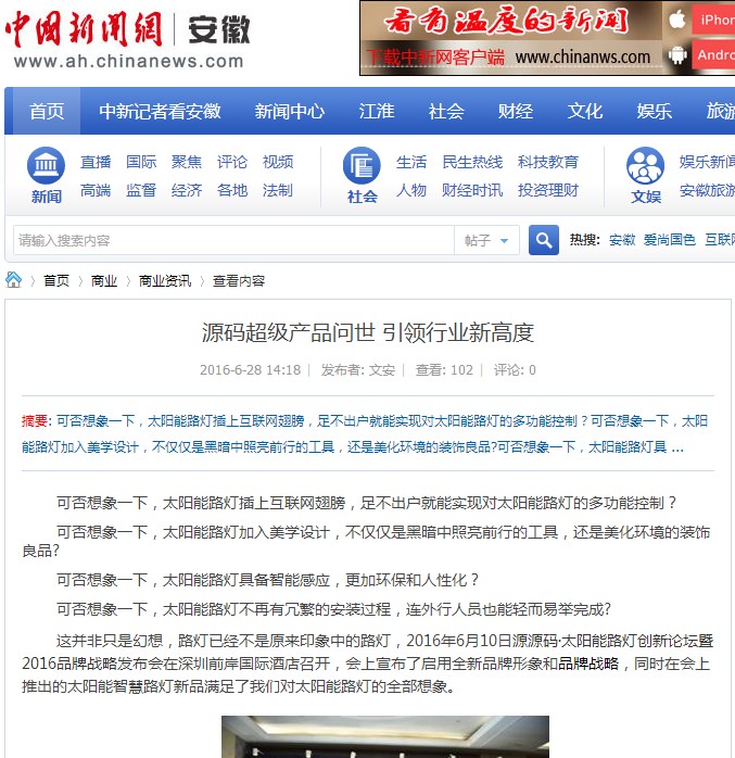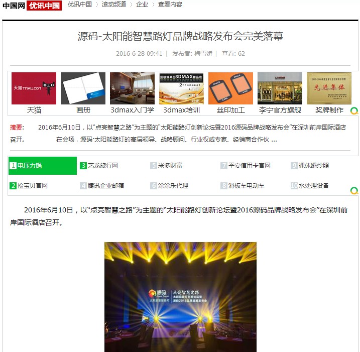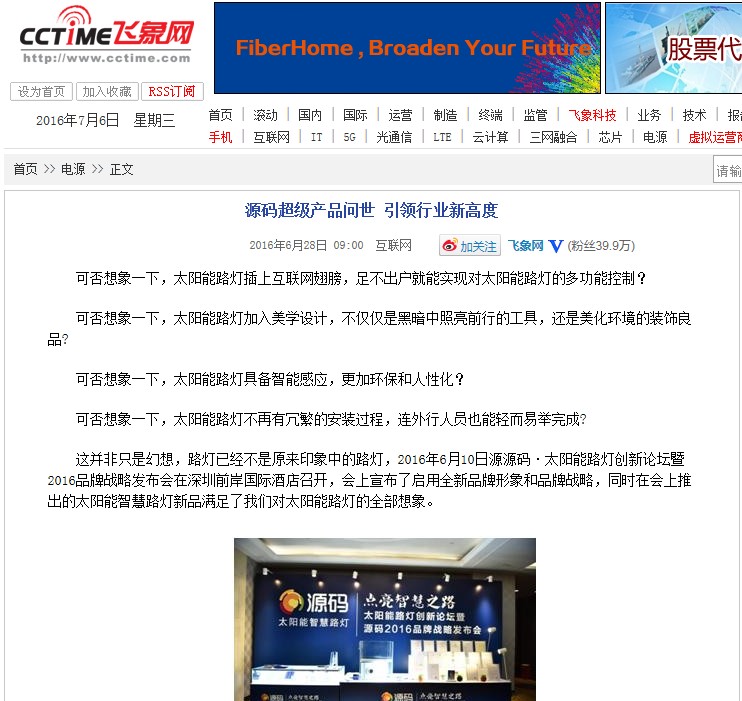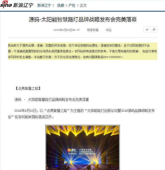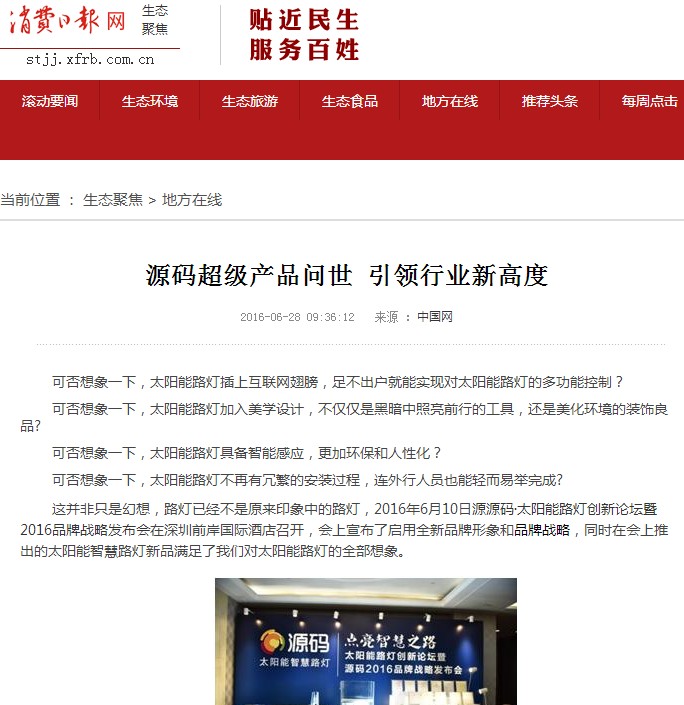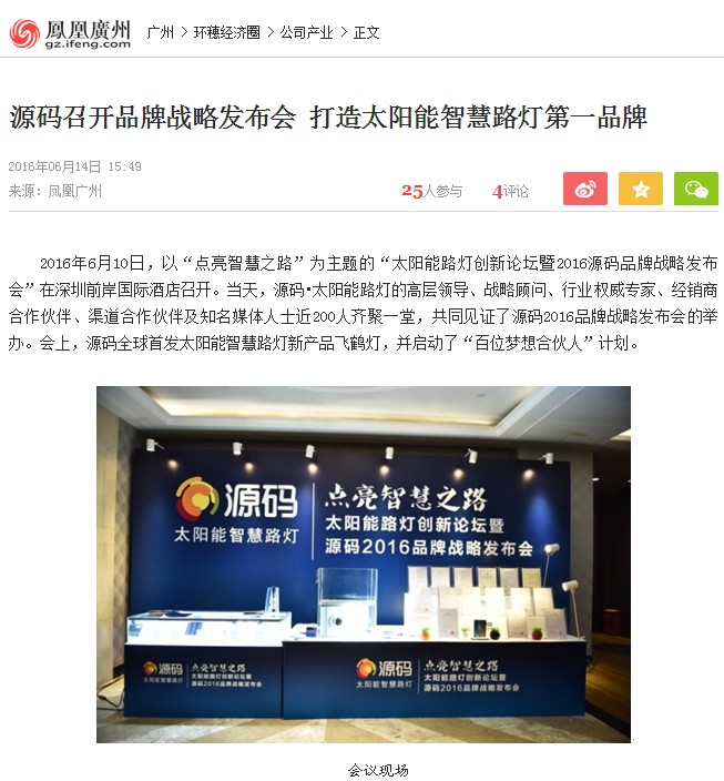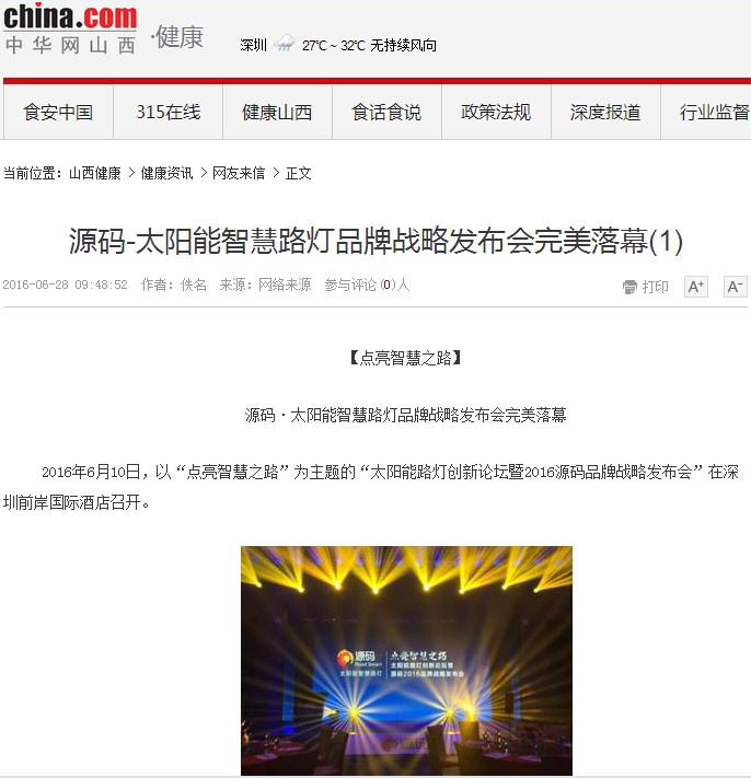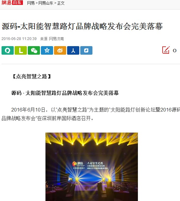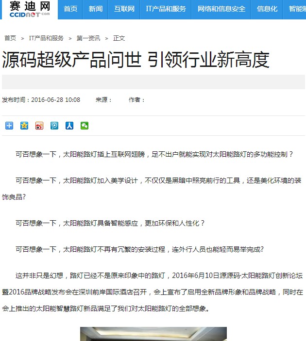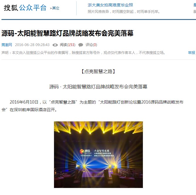 繼源碼在深圳成功舉行太陽(yáng)能路燈創(chuàng)新論壇暨源碼2016品牌戰(zhàn)略發(fā)布會(huì)后,引起了各大媒體和行業(yè)的廣泛關(guān)注,行業(yè)專家柴鈺教授表示,此次源碼發(fā)布會(huì)已經(jīng)顛覆了行業(yè)對(duì)傳統(tǒng)太陽(yáng)能路燈的認(rèn)知,對(duì)太陽(yáng)能路燈行業(yè)的發(fā)展指明了方向。在各大媒體的爭(zhēng)相報(bào)道下,網(wǎng)上掀起一片關(guān)于“源碼”的信息狂潮。