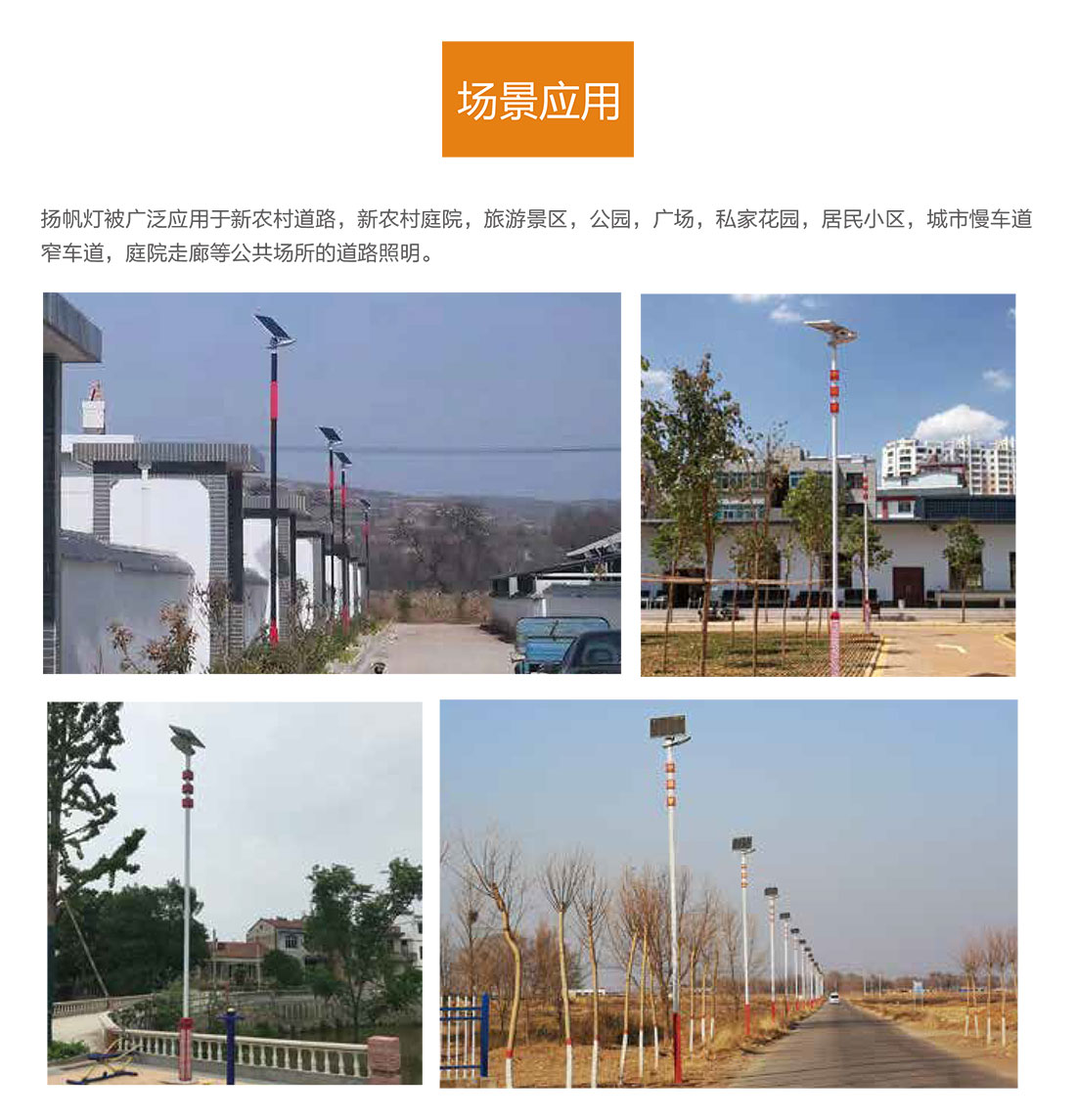 揚(yáng)帆燈作為一體化太陽(yáng)能路燈,被廣泛應(yīng)用于新農(nóng)村道路、旅游景區(qū)、公園、廣場(chǎng)、居民小區(qū)、城市慢車(chē)道/窄車(chē)道等場(chǎng)景。