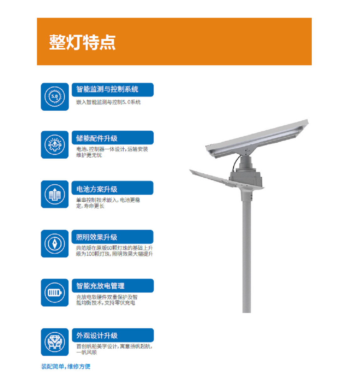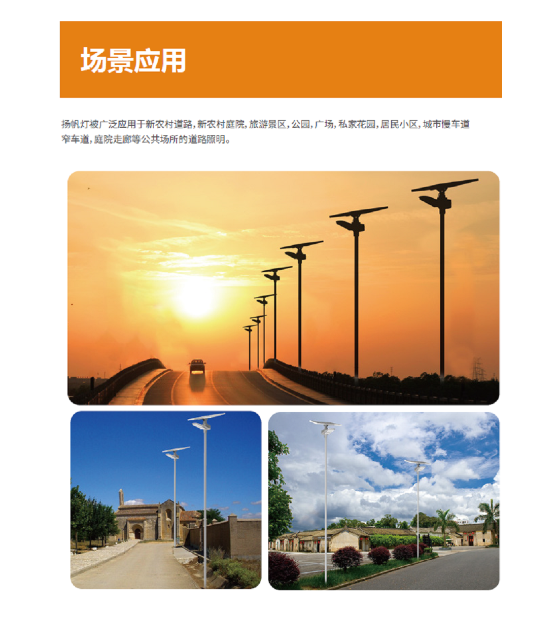 揚帆燈典范版作為揚帆燈的迭代新款,亮度和性價比均大幅提升,被廣泛應用于新農(nóng)村道路、旅游景區(qū)、公園、廣場、居民小區(qū)、城市慢車道/窄車道等場景。